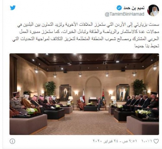 أعرب أمير قطر الشيخ تميم بن حمد عن سعادته وذلك بعد زيارته للاردن التي بدأت أمس ومن المقرر ان تنتهي اليوم الاثنين وذلك عبر تغريدة له على تويتر.