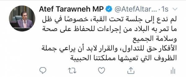 وكتب الطراونة في تغريدة له عبر تويتر: لم ندع إلى جلسة تحت القبة، خصوصًا في ظل ما تمر به البلاد من إجراءات للحفاظ على صحة وسلامة الجميع.