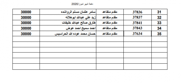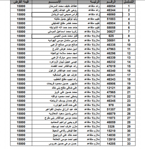 القيادة العامة للقوات المسلحة الاردنية-الجيش العربي/مديرية مؤسسة الاسكان والاشغال العسكرية بأن الضباط وضباط الصف والافراد المذكورين تالياً قد دنت اقدميتهم للحصول على قرض من صندوق الاسكان العسكري وعليهم المراجعة خلال ساعات الدوام الرسمي مصطحبين معهم الوثائق التالية :