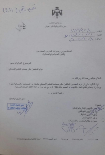أكدت وزارة التربية والتعليم، أن داوم المعلمين المكلفين على حساب التعليم الإضافي يكون يوميا في المدارس.