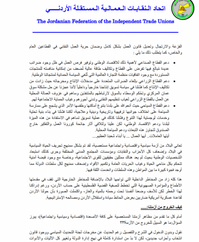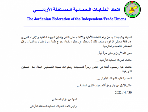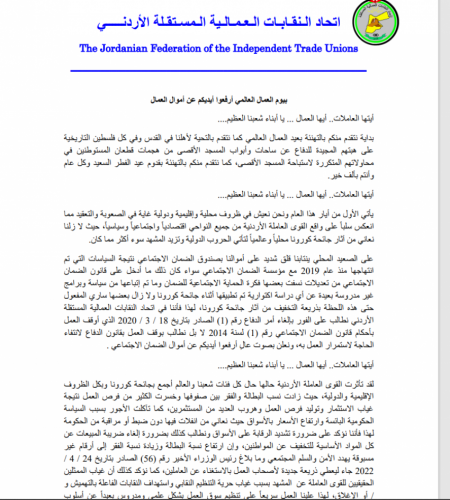 الرأي نيوز - أصدر اتحاد النقابات العمالية المستقلة الأردني اليوم السبت بيانا خاصا، بمناسبة قرب حلول عيد العمال الذي يصادف يوم غد الأحد الأول من أيار 2022 .