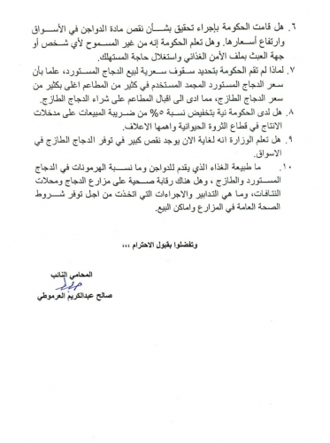 3. هل صحيح ان الحكومة غير قادرة على معالجة مشكلة نقص الدجاج ومحاسبة المحتكرين، ولماذا لم يتم فتح تحقيق موسع لتحديد أسباب المشكلة واحالة العابثين بالسوق إلى النيابة العامة؟