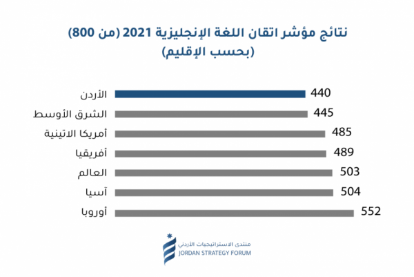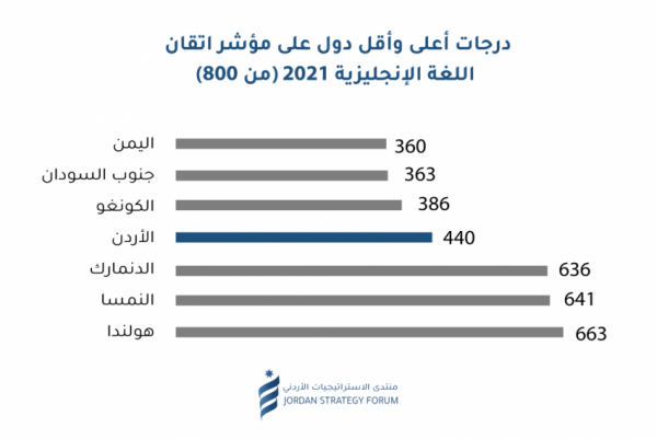 وفي سياق متصل بين المنتدى أنه من المؤسف ملاحظة أن مؤشر إتقان اللغة الإنجليزية لعام 2021 يصنف الأردن بين الدول ذات "الكفاءة المنخفضة جدًا"، مما يوجب على المعنيين في قطاع التعليم بأن يحرصوا على أن يتم تدريس اللغة الانجليزية من قبل أشخاص يتحدثون اللغة بطلاقة ويمتلكون المهارات لتعليمها، بالإضافة إلى مراعاة عدد الساعات المتاحة في المنهج الدراسي، وكذلك النظر في عرض البرامج التلفزيونية والأفلام بلغتها الأصلية، مع استخدام الترجمة إلى العربية بديلا عن الدبلجة.