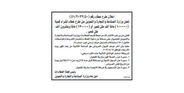 ودعت الراغبين بالاشتراك إلى مراجعة الوزارة للحصول على نسخة من دعوة العطاء، علما بأن آخر موعد لقبول العروض هو الساعة 2 من بعد ظهر يوم الأربعاء الموافق 17/8/2022.