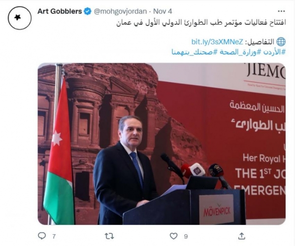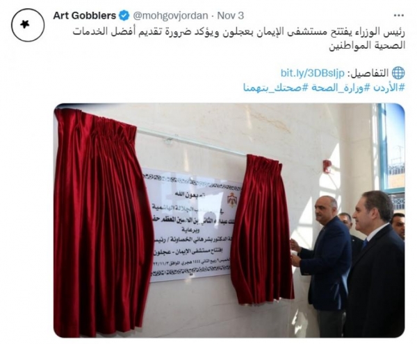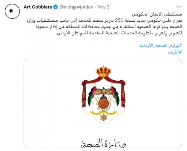 الرأي نيوز - تعرضت صفحة وزارة الصحة الأردنية على منصة تويتر، الى عملية اختراق من جهة تبدو مجهولة المصدر، تحمل اسم "Art Gobblers" وهي موثقة بالعلامة الزرقاء.