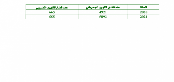 وبحسب التقرير السنوي ومن واقع سجلات دائرة الجمارك العامة، فقد بلغ عدد قضايا التهرب الجمركي 5893 قضية عام 2021 مقارنة بـ 4921 قضية عام 2020.