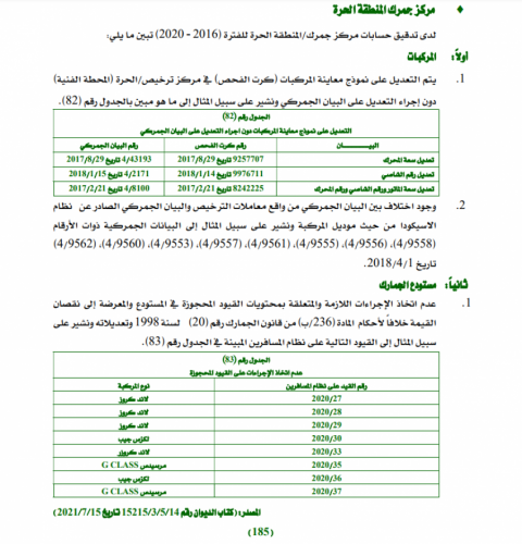 ولدى تدقيق حسابات مركز جمرك المنطقة الحرة للفترة "2016 - 2020" تبين انه يتم تعديل نموذج معاينة المركبات "كرت الفحص" دون إجراء التعديل على البيان الجمركي، كما اضهر التدقيق وجود اختلاف بين المركبات من واقع معاملات الترخيص والبيان الجمركي الصادر على نظام الاسكودا.