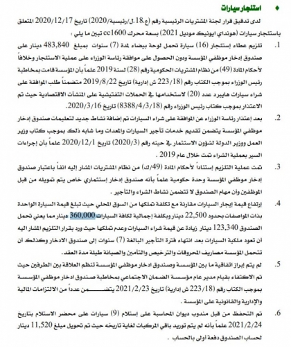 وقال التقرير إن قيمة ايجار السيارات مرتفع مقارنة مع قيمة تملكها من السوق المحلي حيث تبلغ قيمة تملك السيارة الواحدة بذات المواصفات 22.5 ألف دينار وبكلفة اجمالية لكافة السيارات 360 ألف دينار.