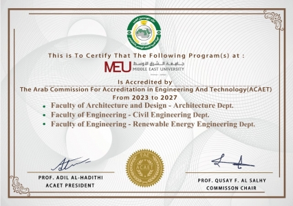 عمّان – منحت الهيئة العربية للاعتماد الهندسي والتكنولوجي، كلية العمارة والتصميم في جامعة الشرق الأوسط الاعتماد الأول لها، إلى جانب تجديد اعتماد برنامجيّ الهندسة المدنية وهندسة الطاقة المتجددة، وذلك بعد استيفاء معايير الاعتماد الهندسي وفق النظام الأساسي للهيئة.