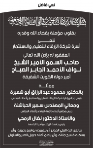 بقلوب مؤمنة بقضاء الله وقدره تنعى أسرة شركة الزرقاء للتعليم والاستثمار، المرحوم صاحب السمو الأمير الشيخ نــــواف الأحمــــد الجابــــر الصبــــاح أمير دولة الكويت الشقيقة، الذي انتقل إلى رحمة الله تعالى