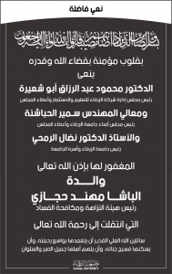 أسرة جامعة الزرقاء تنعى والدة الدكتور مهند حجازي