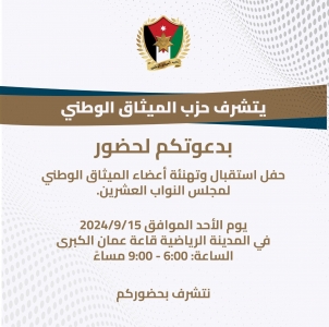 يقيم حزب الميثاق الوطني حفلاً لإستقبال وتهنئة اعضاء الحزب اللذين فازوا بالانتخابات النيابية لمجلس النواب العشرين .
