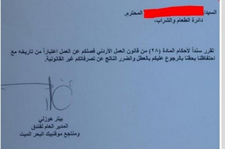 تاسعا : لماذا لم يذكر السيد المدير العام انه قد قام اليوم بفصل 47 موظفا اردنيا ( مرفق صوره عن قرار فصل احد الموظفين ) طالبوا بحقوقهم ليس الا ؟