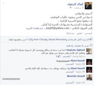 نشر النائب كمال الزغول منشورا على صفحته الفيسبوكية طالب خلاله الراغبين بالتوظيف ارسال طلبات التوظيف مرفقة بالسيرة الذاتيه على ايميله الشخصي الذي نشره ايضا .