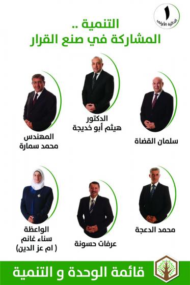 حيث ضمت الكتلة نخبة مميزة من رجالات الوطن الاكاديميين والسياسيين والمثقفين وسط اعتبار مراقبون بانها الكتلة الاكثر حظأ في الدائرة الاولى بالعاصمة عمان نظرأ لما تحتويه من برنامج عمل وخطط مستقبلية تنعكس بالايجاب لصالح الشارع الاردني. حيث ضمت القائمة شخصيات وطنية عرفت باخلاصها وانتمائها للوطن والمواطن ، وحرصت قائمة الوحدة والتنمية على تجديد الخطاب السياسي والديني الايدلوجي لمكافحة الارهاب لتفعيل الدور المبذول من المملكة اتجاه الارهاب لتجفيف منابع الفكر الظلالي والعمل على نقل رسالة الدين السمح التي تسعى لها رسالة عمان .