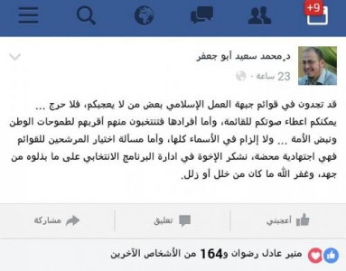 - دعا احد أعضاء ما يسمى مجلس علماء الشريعة في جماعة الاخوان المسلكين غير المرخصة محمد سعيد أبو جعفر الأردنيين ممن لا يعجبهم أفراد في قوائم جبهة العمل الإسلامي الذراع السياسية للجماعة، عدم التصويت لهم، والتصويت لما سماهم 'الأقرب لطموحاتهم'، والتمييز بين أعضاء القوائم. وقال أبوجعفر عبر صفحته في 'فيسبوك': 'قد تجدون في قوائم جبهة العمل الإسلامي بعض من لا يعجبكم، فلا حرج ... يمكنكم اعطاء صوتكم للقائمة، وأما أفرادها فتنتخبون منهم أقربهم لطموحات الوطن ونبض الأمة. وشدد أبو جعفر: 'لا إلزام في الأسماء كلها، وأما مسألة اختيار المرشحين للقوائم فهي اجتهادية محضة، نشكر الإخوة في ادارة البرنامج الانتخابي على ما بذلوه من جهد، وغفر الله ما كان من خلل أو زلل'. يذكر أن الجماعة غير المرخصة شكل حزبها 19 قائمة في دوائر المملكة، ليس مل أعضائها يتبع للجماعة، فمنهم مستقلون ومتقاعدون عسكريون، ومرشحون عن المقاعد المسيحية.