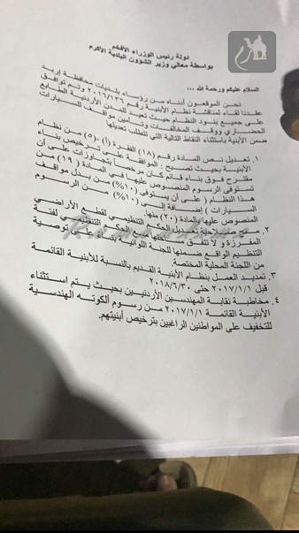 وجه 10 رؤساء بلديات من محافظة اربد مذكرة الى رئيس الوزراء الدكتور هاني الملقي بواسطة وزير البلديات وليد المصري، بالموافقة على جميع بنود النظام التي تعيد الى المدن الاردنية رونقها في التنظيم ووقف المخالفات وتامين مواقف للسيارات ضمن الابنية باستثناء النقاط التي لا يتطلب تعديلها.