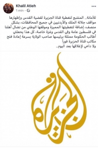 للأمانة.. المتتبع لتغطية قناة الجزيرة لقضية القدس وإظهارها مواقف جلالة الملك والأردنيين في جميع المحافظات، بشكل منصف، إضافة لتغطيتها المميزة وموقفها الوطني من نضال أهلنا في فلسطين عامة وفِي القدس وغزة خاصة، كل هذا يحعلني أطالب الحكومة ممثلة برئيسها صاحب الولاية بسرعة إعادة فتح مكاتب قناة الحزيرة فوراً.