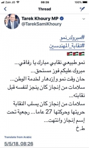 بارك النائب طارق خوري نتائج انتخابات نقابة المهندسين التي جرت يوم أمس, وعلق خوري على صفحاته في التواصل الاجتماعي بأن ما جرى من نتائج للانتخابات هو نمو طبيعي نقابي مبارك, وأضاف انه قد حان الوقت للنمو والازدهار لخدمة الوطن.