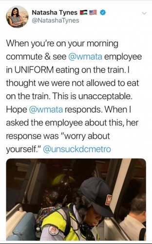 ومما جاء في تغريدة ناتاشا: "أعتقد أنه من عدم المسموح لنا أن نتناول الطعام في المترو. هذا غير مقبول. وأتمنى من شركة المترو والقطارات أن ترد علي. عندما سألت الموظف رد علي: انتبهي لنفسك".