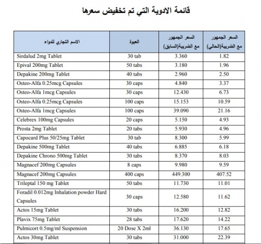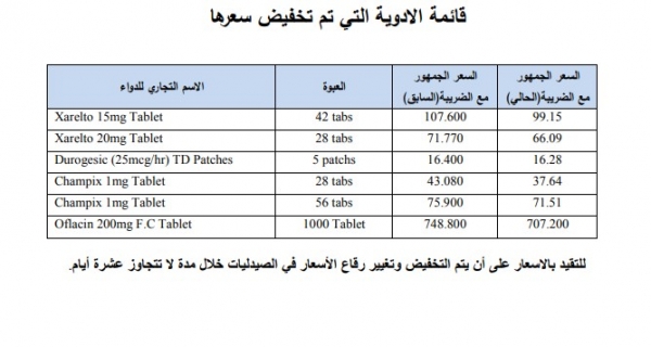 نشرت المؤسسة العامة للغذاء والدواء عبر موقعها الألكتروني القائمة الاولية لانواع واسعار الأدوية التي تم تخفيض اسعارها.