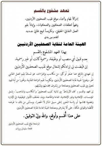 إدراكاً لمهام وأعباء موقع نقيب الصحفيين الأردنيين، وتفهماً لتطلعات الصُحافيين والصُحافيات، وإيماناً بقيم العمل النقابيّ الحقيقيّ، وتكريساً لنهج نقابيّ جديد، أتقدم - بين يدي الهيئة العامة لنقابة الصحفيين الأردنيين - بهذا العهد، المشفوع بالقسم، بعدم قبول أي منصب أو وظيفة، رسميةٍ كانت أو غير رسمية، إن قيّضت لي إرادتكم إشغال موقع نقيب الصحفيين الأردنيين.