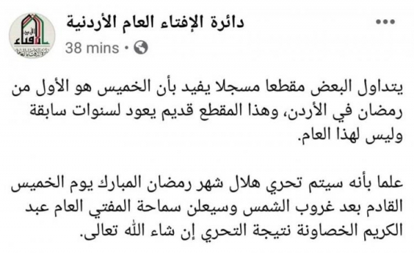 قالت دائرة الافتاء العام إن مقطع فيديو متداول عبر صفحات التواصل الاجتماعي يفيد بان الخميس هو اول ايام رمضان في الاردن، مؤكدة عدم صحة هذا المقطع.