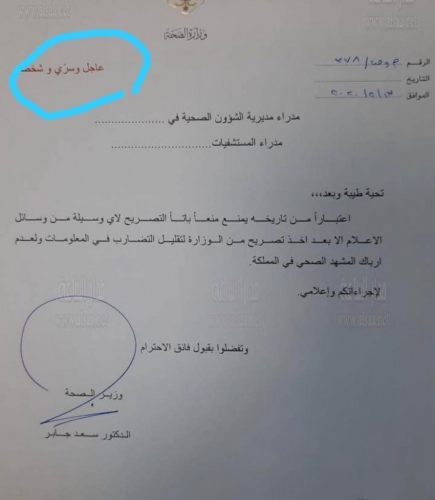 عمم وزير الصحة الدكتور سعد جابر على مدراء الصحة والمستشفيات في المملكة، بمنع التصريح لأي وسيلة إعلام منعا باتا الا بعد اخذ تصريح من الوزارة.