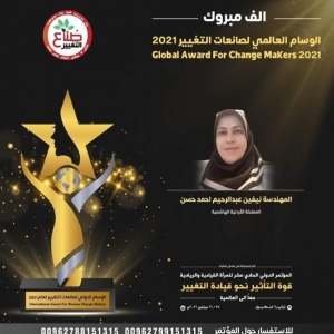 عمان / حصلت المهندسة الأردنية نيفين عبد الرحيم حسن الخبيرة والباحثة في مجال علوم وتكنولوجيا الفضاء (المبتعثة من قِبل الحكومة الأردنية للحصول على شهادرة الدكتوراة في مجال علوم الفضاء في الصين) على الوسام العالمي لصانعات التغيير لعام 2021 ضمن المسابقة التي ينظمها صُنّاع التغيير في الوطن العربي وبمشاركة 220 مرشحة من مختلف الدول العربية إضافة الى تركيا.