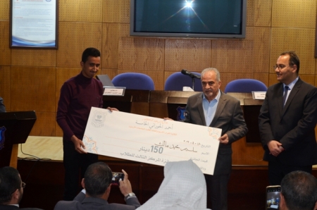 كما تم تكريم الطلبة الفائزين بالمراكز الثلاثة الأولى في الجائزة، حيث تمكن الطالب أويس خليل الدغامين/ جامعة عمان الأهلية من الفوز بالمركز الأول لمسابقة الطلاب، وجاء بالمرتبة الثانية الطالب عالمين آدم عبد الكريم/ جامعة مؤتة، وحل الطالب سليم محمد مالك/ جامعة الشرق الأوسط بالمرتبة الثالثة.