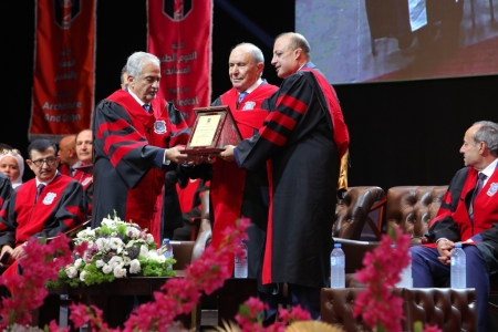 •هذا وقد تم تقديم درع تكريمي لمعالي راعي الحفل الدكتور محمد صالح الحوراني من قبل الدكتور ماهر الحوراني رئيس هيئة المديرين والاستاذ الدكتور ساري حمدان رئيس الجامعة .