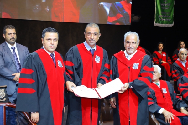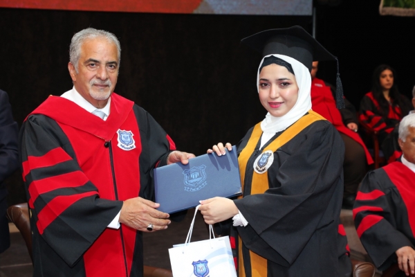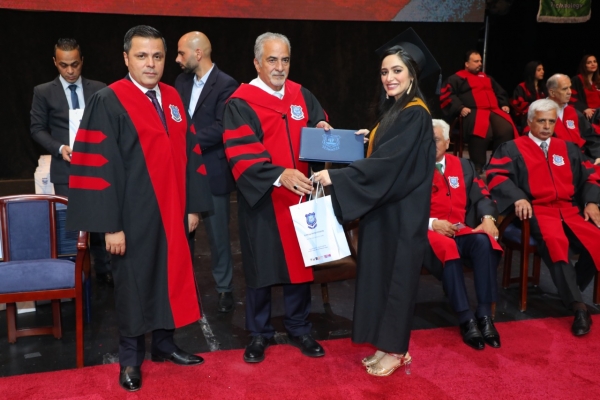 وختم كلمته قائلا : أيها الخريجون الأعزاء أهنئكم بالأصالة عن نفسي ونيابة عن زملائي أعضاء الهيئتين التدريسية والإدارية متمنياً مستقبلاً مكللاً بالنجاح في حياتكم العملية وفي خدمة مجتمعاتكم.