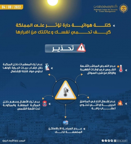 الرأي نيوز - أصدر المركز الوطني للامن وادار الازمات تحذيرات ونصائح مهمة للمواطنين تزامنا مع تأثر المملكة بالموجة الحارة.