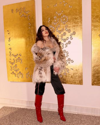 وإرتدت هيفا وهبي سروال رياضي واسع باللون الأسود، ونسقت معه توب من الشاموا باللون الأسود و الذهبي من دون أكمام، وفوقه معطف من الفرو باللون البيج، وحذاء شتوي عالي من اللون الأحمر