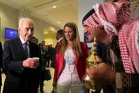 وهو يقدم القهوة العربية لبيريز على هامش المنتدى الاقتصادي العالمي الذي بدأت