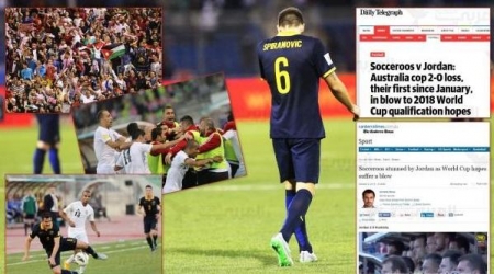 خرجت الصحف الأسترالية بعناوين مصدومة نتيجة الهزيمة التي لحقت بمنتخب بلادها على يد المنتخب الأردني بهدفين نظيفين في التصفيات المزدوجة لكأس العالم لكرة القدم 2018 في روسيا وكأس آسيا 2019 بالإمارات، بعدما ألحق النشامى بضيفه الأسترالي أول هزيمة بالتصفيات. ولقّن المنتخب الأردني نظيره بطل القارة الآسيوية درساً كروياً بامتياز، تمكن من خلاله منتخب الأردن من انتزاع صدارة المجموعة الثانية في التصفيات حيث رفع الأردن رصيده إلى 10 نقاط من أربع مباريات بفارق نقطة واحدة عن أستراليا بينما تحتل قرغيزستان المركز الثالث بأربع نقاط ثم طاجيكستان وبنغلادش في المركزين الرابع والخامس بنقطة واحدة لكل منهما.