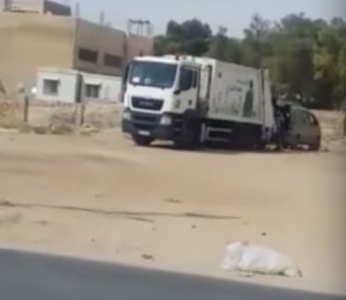 في مشهد مثير للريبة، تقف شاحنة نفايات 'كابسة' تابعة لأمانة عمان، في منطقة خالية من السكان على طريق الحزام الدائري، ويقوم طاقمها بنقل كراتين لباص خاص يقف ملاصقاً للشاحنة.