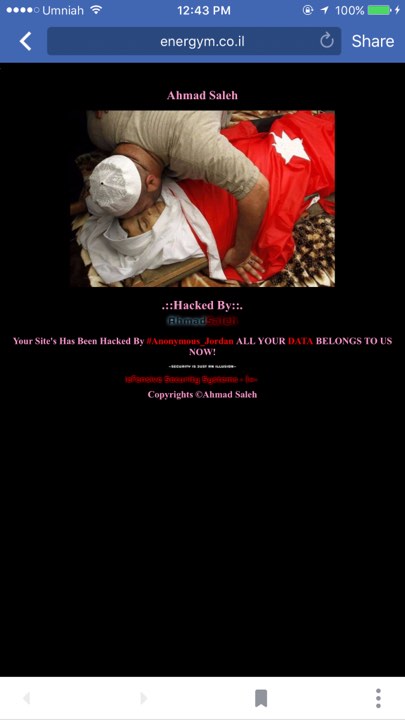 الراي نيوز - تمكن الهكر الاردني أحمد صالح من السيطرة على عدد من المواقع الإسرائيلية ووضع صورة الشهيد الأردني محمد زكريا الجواوده عليها.