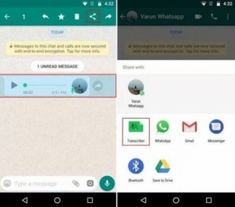 3- الآن أصبح التطبيق جاهزاً. قم بفتح أي دردشة لك في واتس اب حيث توجد الرسالة الصوتية التي تريد تحويلها. انقر مع الاستمرار على الرسالة الصوتية لتحديدها. ثم انقر على أيقونة السهم في الشريط العلوي. من قائمة الخيارات التي تظهر، حدد Transcriber.