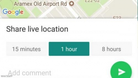 عند الضغط على الخيار الأخير، تظهر قائمة تشمل 15 دقيقة و1 ساعة و8 ساعات وهي المدة التي يريد للآخرين أن يتابعوا خلالها موقعه الجغرافي وتغيره بشكل مباشر، ويمكن إضافة تعليق ثم الضغط على زر الإرسال.