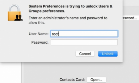 ويمكن فتح الجهاز من خلال وضع اسم المستخدم root ليتم تسجيل دخولك كمسخدم عادي، كما يمكن ذلك من خلال التوجه إلى تفضيلات النظام في جهازك ثم المستخدمون واختيار قفل يمكنك إعادة تسجيل الدخول مرة أخرى فقط بوضع كلمة root دون وضع كلمة مرور والنقر عدة مرات ستجد أن النظام سجل الدخول ومنحك كامل الصلاحيات.